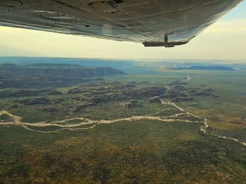 Following numerous orbits of the crater, allowing for extensive photo opportunities, a course is set northward, passing overhead significant features such as Sawpit Gorge, Palm Springs Oasis, Ruby Queen and Mt Bradley Gold Mines, the Panton River, and Alice Downs Homestead.